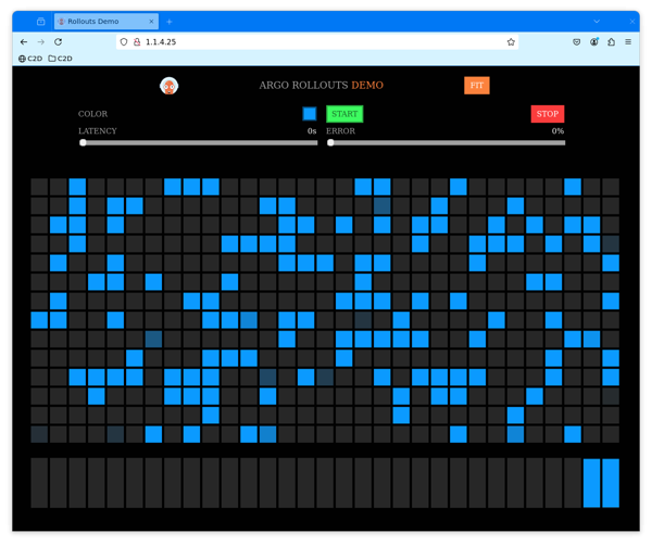 Rollouts Demo application. With only “blue” pods running, the app should look